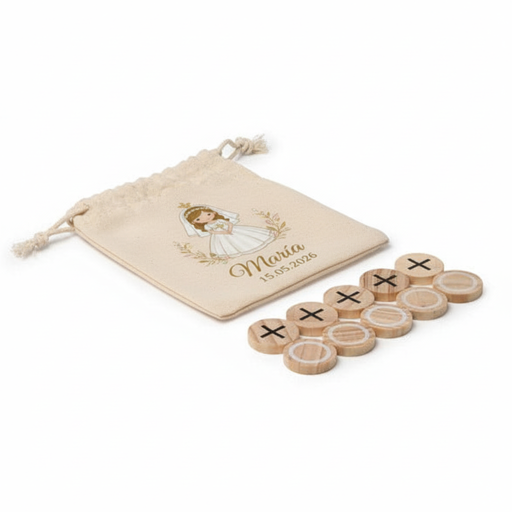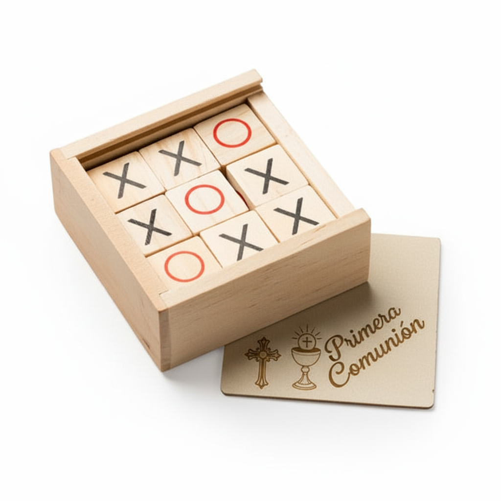 Set de juego 3 en raya con caja de madera personalizado. Ideal para regalo de comunión o cumpleaños para niña o niño. Mas información contacto por WhatsApp 640532034
