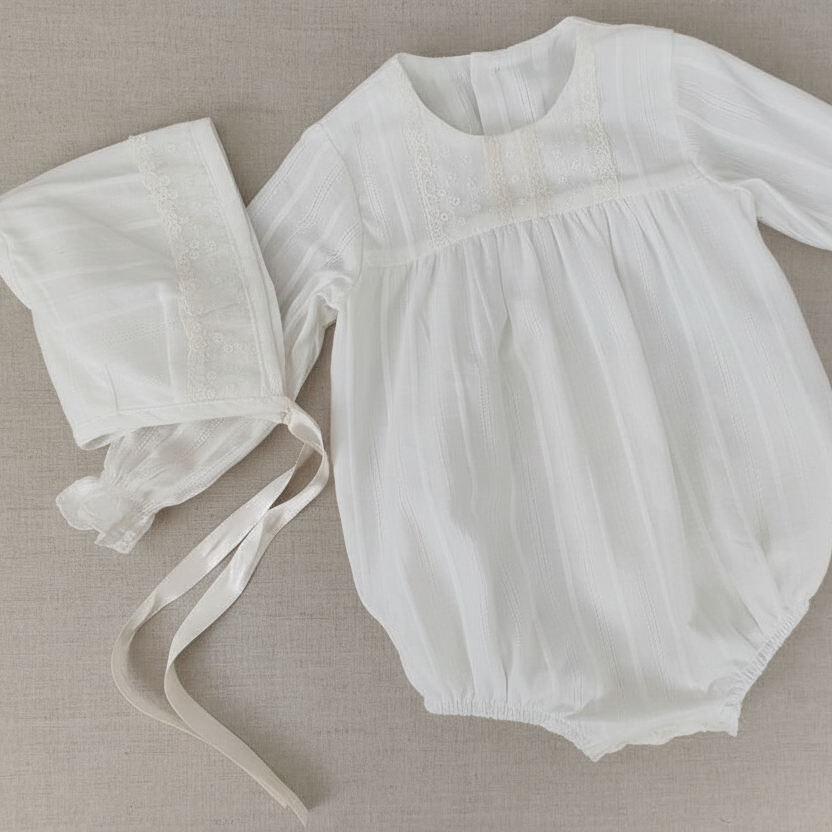 Pelele tela rayada con manga larga ideal para ceremonia. Se completa con una capota haciendo juego.